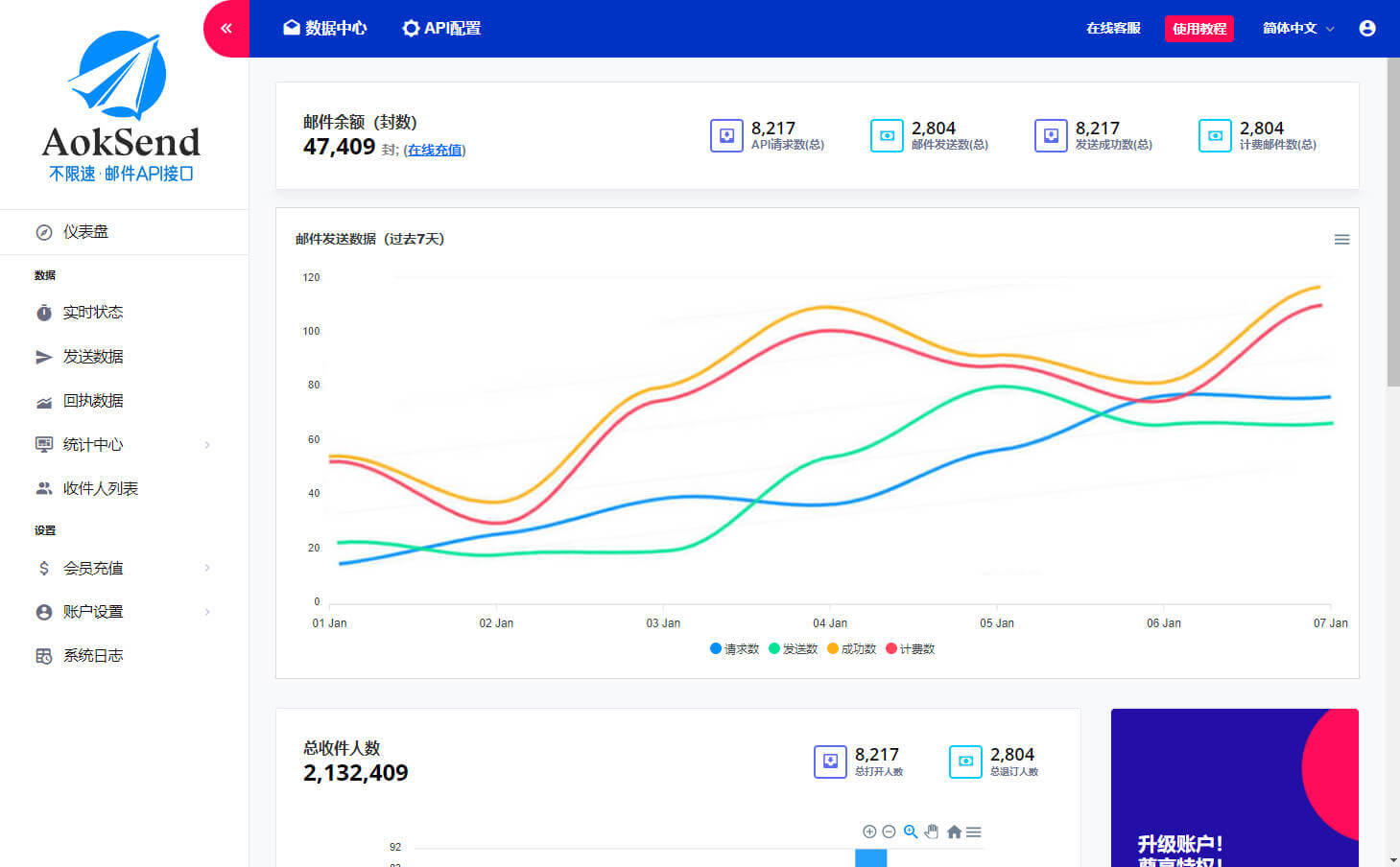 AokSend是一款不限速的郵件API,為客戶提供多種郵件發送API接口及觸發式郵件推送服務。綜合送達率99%、進箱率98%。